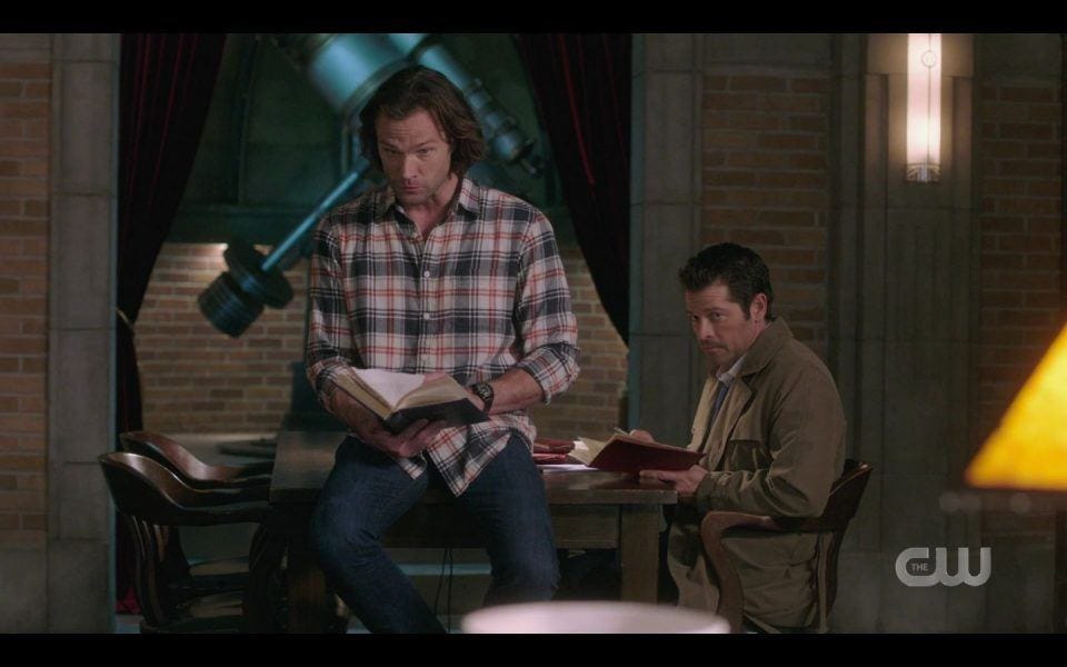 Donatello reluctantly agrees to try to translate the tablet and figure out how to lock God up like he did Amara, since they can’t kill him without disrupting the balance of the universe. While Donatello reads and munches his ever present fried chicken, Sam and Dean and Cas all huddle around, doing a very bad acting job of pretending to read.