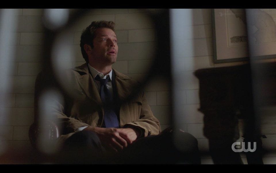 Back to the goal of the episode: finding Michael. I’m not entirely sure why we needed Donatello to say where Michael was, because instead of going to Egypt to get him, Cas just sits down at the chessboard on the landing and reaches out to him on Angel Radio. But that’s okay because this is a beautifully filmed scene, Castiel glimpsed through the grate, behind bars, the chessboard in front of him as he plays a rather brilliant game to get Michael to help them.
