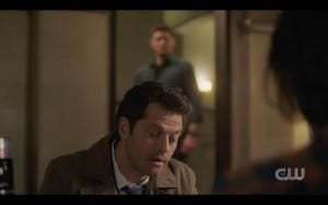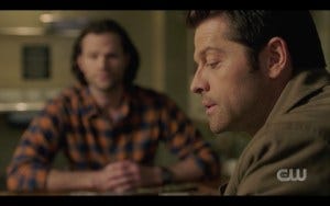Sam doesn’t say anything here, but his anguish is just as clear. Unlike Dean, he doesn’t lash out and he struggles not to blame Cas (or even Jack), but it costs him because he has no defense, and his sadness shows on his face thanks to Jared Padalecki’s wonderful acting. All three actors did a wonderful (painful) job in this scene.