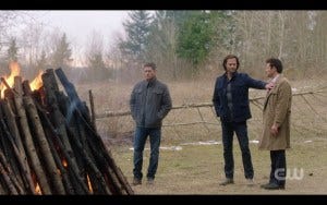 The camera pulls back to show the brothers and the angel and the Impala flanking the pyre.