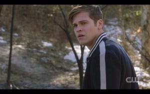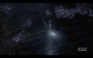 Sam and Dean try to track down Jack, thanks to Smart!Sam’s tech skills. In the Impala, Sam tries to defend Jack, saying that he must have thought he was helping (by killing Felix). Dean is already in lashing out mode, snapping that he doesn’t care about the damn snake and refusing to see the possible human parallels. The boys find Nick’s partially incinerated corpse, and then they find an ominous and large area of scorched earth. Director Nina Lopez-Corrado gives us a beautiful crane shot, looking down on the angelically produced wasteland area illuminated by Sam and Dean’s flashlights.
