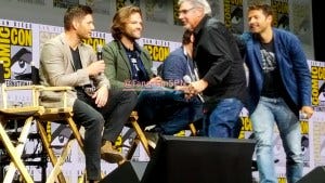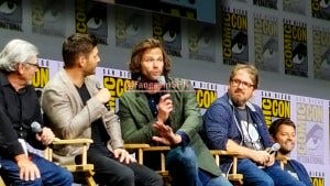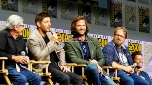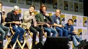 Showrunners Bob Singer and Andrew Dabb, along with Jared Padalecki and Jensen Ackles, took the stage next. Jared and Jensen shared their customary fist bump that starts and ends most of their panels, and Jared pulled off his often present beanie to show off that glorious mane of hair that Richard had just joked would qualify for its own spinoff. Jared and Jensen had apparently tried on masks to go out into the crowd to watch Kansas, but couldn’t find any that worked.