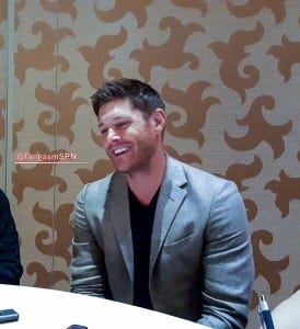 I had the chance to ask a few questions of Jared, Jensen, Misha, Andrew and Bob later that afternoon in the press room. Both the cast and anyone who had been at the panel were still sort of blown away by the fact that Kansas had played for us, so spirits were high all around. I had done press rooms years ago but it had been a few years, so I was busy worrying about my brand spanking new tripod being able to hold up my phone without tipping over when suddenly Jensen Ackles appeared at our table. That caused some minor panic and equipment fumbling on my part before I regained my composure, but that’s not exactly a rare occurrence for me and Mr. Ackles. However, I got a nice wink of acknowledgement so maybe he didn’t notice the fumbling. I’m going with that.