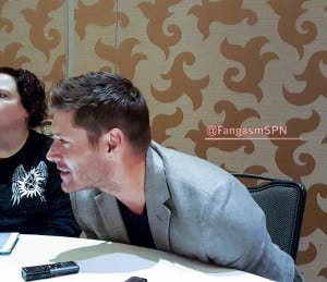 I had a few minutes to try to reposition my camera a bit closer so it would pick up less of the room noise and more of just the person talking, and then Jared took a seat at our table. Someone jumped right in and asked a rather deep question about whether or not Sam realizes how much Dean had to be a parent to Sam as well as his brother.