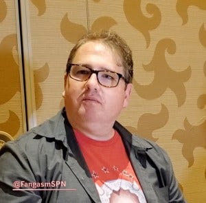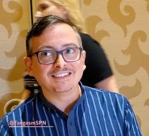 Brad Buckner talked about the emotionality of the Supernatural panel that preceded the press room, especially when the actors were asked to reflect on their many years on the show. He shared that all Supernatural scripts always end with “To Be Continued” – and that the other day the writers all realized that Andrew is now writing a script that will instead say “The End”. Cue lots of sniffling at our table.