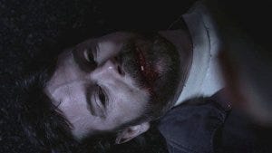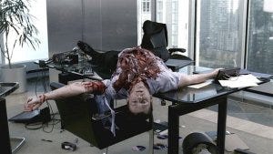 The next morning Madison makes coffee in her office when she notices a smear of blood on the wall – and then more on the floor. She walks with trepidation toward Nate’s office, and we see his hand covered in blood before we see him. When she rounds the corner, Nate is lying dead on his desk, torn apart. She drops the coffee pot, screaming. The pot shatters.