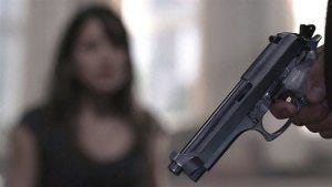 He aims his gun but doesn’t shoot, instead waiting for her to charge and locking her in her bedroom, moving a giant piece of furniture in front of the door for good measure.