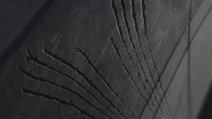 Sam and Dean pick the lock and search Kurt’s apartment, then hear a noise and a crash outside. Dean finds claw marks on the side of the building outside sliding glass doors to a balcony and calls Sam over to see.