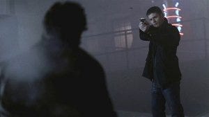 Dean takes the gun from Sam gently, as Queensryche’s ‘Silent Lucidity’ begins to play – another thing that makes this one of the most memorable scenes in the entire show. Sam leaves the room and Dean follows, Sam trying to hold back tears.