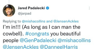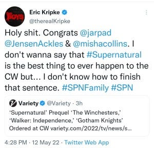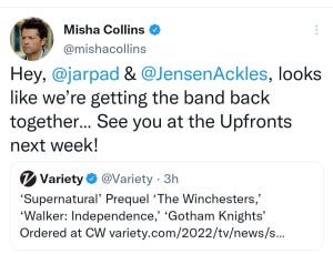 It’s been a great feeling to watch my timeline explode all day long with fans and other Supernatural cast reacting to all the good news. Misha Collins tweeted his excitement to his former co-stars, who will perhaps all be at the Upfronts next week (if Ackles isn’t committed to The Boys publicity and Padalecki isn’t finishing up Walker).