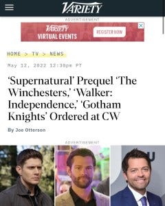 The chances for the SPN pilots were clearly improved by that news, so it wasn’t shocking when all three pilots with Supernatural cast connections were picked up – ‘The Winchesters’ prequel with Jensen and Danneel Ackles and Supernatural writer alum Robbie Thompson executive producing and Jensen doing the Dean Winchester narrating, the Walker prequel ‘Walker: Independence’ aka Windy, with Jared Padalecki executive producing and Walker alum Matt Barr one of the stars; and Gotham Knights, with Misha Collins as Harvey Dent/Two-Face.