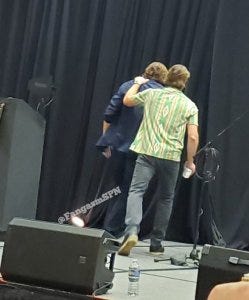 Jensen smiled as he realized what Jared was saying, then grabbed Jared by the shoulders as they left the stage in reassurance and appreciation.