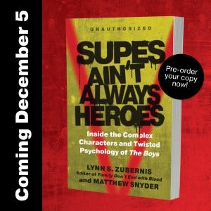 Also, an important update: in support of the strike, we’ve decided to move the release date of ‘Supes Ain’t Always Hereos: Inside the Complex Characters and Twisted Psychology of The Boys’ to December 5.