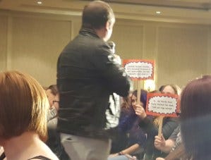 When Mark Sheppard came onstage, I immediately got emotional – we are all very aware that he has only a handful of Creation cons left to do. A fan had made signs with lots of Crowley’s priceless lines on them, and they were distributed throughout the ballroom. When Mark realized what they were, and how many of them there were, he clearly got emotional too.