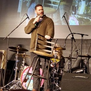 He carried the table to the side of the stage, barely pausing to toss the water bottles right off it.