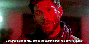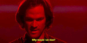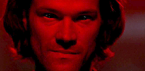 Our sense of dread builds as the body count increases, and when Dean finally demands “Where is he?” I think we all knew who he was looking for. It’s still shocking to see Sam standing there, lit in red, a halo of beautiful hair around that handsome familiar face – which looks totally unfamiliar because of the cold expression. All Sam’s empathy, which Jared Padalecki is so skilled at showing us, is gone. Erased. Sam’s voice is cold, even in the face of his brother’s pleading. Long before his eyes go black, we know that this Sam is not going to hear Dean. And that is profoundly terrifying, upending the one thing that we all count on for this Show. The Winchesters always, always care about each other.