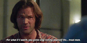 He’s right. Dean also plays up his self-professed moniker ‘the meat man’ for a little levity for his brother, even as Sam uncomfortably protests that it doesn’t mean what Dean thinks it means. (The entire fandom knows what it means now, btw, and most of us are fairly sure Dean Winchester knows exactly what it means too. According to fanfic, it’s pretty accurate. Just saying.)