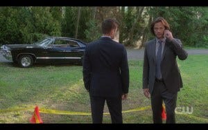 Sam and Dean visit the crime scene, and director Ackles gives us some very lovely shots of them in suits, including lots of Dean from behind and yes I did notice how that suit jacket stretches so tightly over those broad shoulders and then tapers down to…. Anyway. Nice shots, director Ackles.
