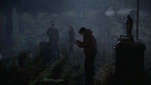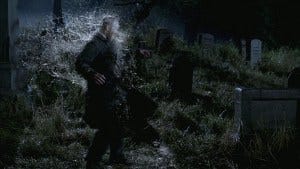 Sam reads in Latin as the spirit arrives and tosses Dean right into a gravestone. Ouch!