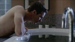 Cut to a man in pajama bottoms brushing his teeth, as a shadowy figure crosses in front of the screen. Suddenly his bathtub starts to fill with sea water, right up to the top. He pulls plug but it won’t go down.