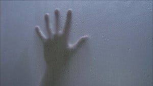 We see a hand on the glass, and she opens the door, but of course doesn’t see anything. But back in the shower, someone grabs her from behind. We see her head slamming against the frosted glass, and her hand scrapes down it as she falls.
