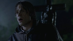 Thunder crashes in the distance and the wind whips up as it starts to rain, clouds blowing across the full moon, both boys getting wet (which we don’t see all that often on the show – poor Jared and Jensen but, like virtually everything, it’s a good look on Sam and Dean).