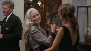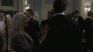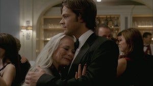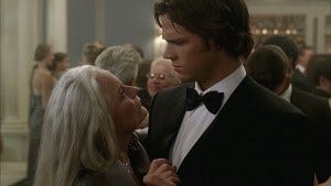 Downstairs, Sam and Gert dance, Gert saying that if “Alex” and Dean are entertaining themselves elsewhere, maybe the two of them should too. She slides a hand down Sam’s broad back and grabs his ass, saying he reminds her of her late husband, who was also shy – until they got “below deck”.