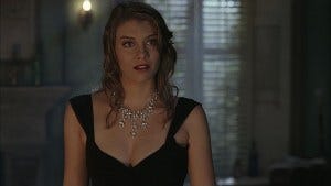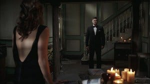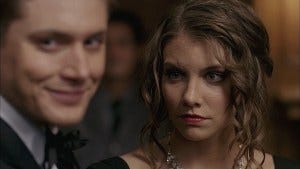 Bela has an idea though, suddenly “fainting” and falling into Dean’s arms. He gets it right away, playing the role of a worried husband and asking if there was crab in the food.
