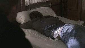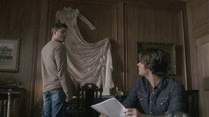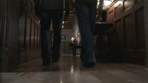 After making sure Susan is out, the brothers break into her room, Sam picking the lock. Slowly they go upstairs to where Grandma Rose’s room is. It’s a beautifully ominous scene, shot through the railings, shadows falling over Sam and Dean.
