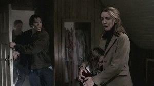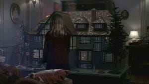 Sherwin packs up his car and drives off too, leaving just Susan and Tyler. A toy swing set outside the dollhouse starts to swing all by itself, as the wind starts to blow outside where Susan is packing up the car. She notices the swings in the yard moving, alarmed, then the spinner rapidly spinning, and then suddenly her car starts up by itself and starts roaring right at her.