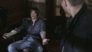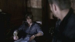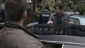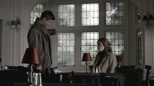Dean goes to talk to Susan about what happened. When he returns to their room, Sam is sitting alone in the dark, slumped in a chair after watching them wheel the lawyer’s body away (moping and silently staring out the window just like Dean expected him to do – nicely done, Show).