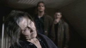 Sam and Dean decide the mysterious shut-in grandma might be doing just that. Dean suggests Sam go online and see if she has a history – if she’s “whacked somebody before.”