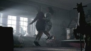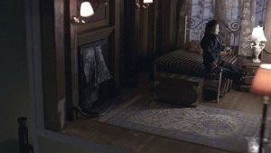 Tyler puts a doll in the rocking chair, but when she looks again he’s not there – instead he’s at the bottom of the staircase, head askew.
