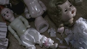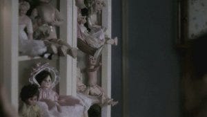 Just then, we hear her mother scream. At the foot of the stairs is the hapless moving man, twisted up, head askew just like the doll, in a pool of his own blood and a cracked doll next to him on the floor.