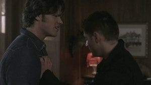 While Dean isn’t entirely comfortable with having his own sexuality questioned or assumed, in the early seasons he takes great delight in portraying Sam as “girly” – maybe just because he delights in being the asshole big brother teasing his little brother and unfortunately that’s often done in misogynistic ways in our culture, or maybe as a way of shoring up his perception of his own masculinity. I’m not sure if Sam is pissed about that because he’s carrying around some misogynistic or homophobic baggage too or if he’s just pissed because he knows Dean is trying to get to him.