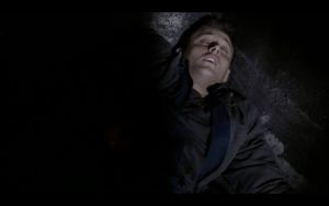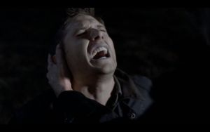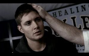 He puts his hand on Dean’s head and his eyes close. Dean sinks to his knees and Sam is half out of his chair, protectively, as Dean falls down, seemingly fainted.