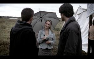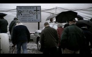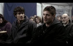 Anyway, the boys head to Nebraska, where Sam has found a ‘specialist’. A big tent pitched in a muddy field on a cloudy, dark and rainy day. Sam runs around to the passenger side to help Dean out of the car, reassuring him with “I gotcha.” Dean shrugs him off because of course he does, realizing they’re at a faith healer.