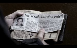Dean tries to stop her, but she starts yelling help me help me and the police of course throw Dean out. The spell is interrupted though, so the protestor guy is saved. For now. The cops “escort” Dean out, Sue Ann saying they can let him go, the Lord will deal with him.
