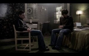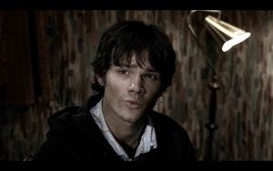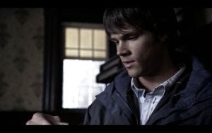 Dean collapses into a chair, but he manages a weak smile. At this point, he’s not very sure how Sam feels about him, or whether Sam really wants him there, so Sam’s determination to not let him go must be pretty powerful to hear.
