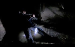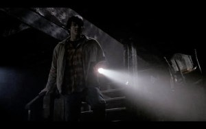 They know they only get one shot with these particular monsters, so the tension is high right from the start. Sam and Dean descend the stairs with only the light of their flashlights into the requisite dark damp basement. They rescue two little children, and we know they’re siblings because Dean instructs the little boy to ‘grab your sister’s hand’. Sam gets them up the stairs to safety but something grabs Dean’s leg and yanks him back. He fires his electric stun gun but misses, yelling at Sam to get the kids out of there. Sam tosses his stun gun to Dean, but the rawhead knocks Dean over and he lands in a puddle of water on the floor.