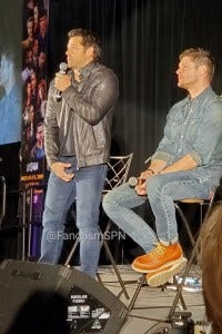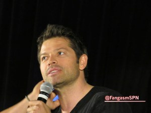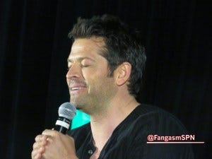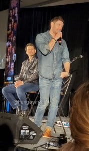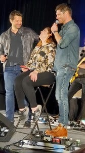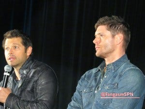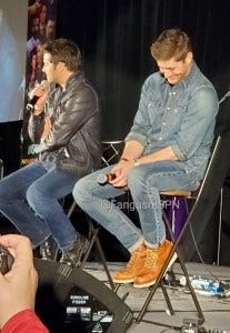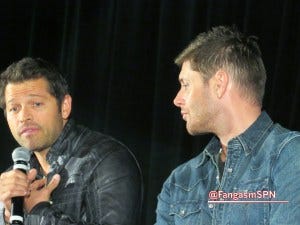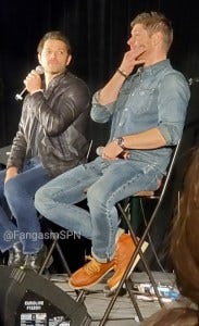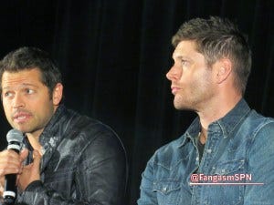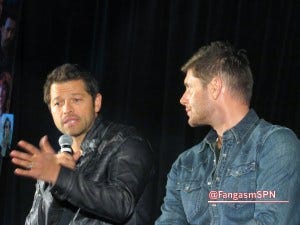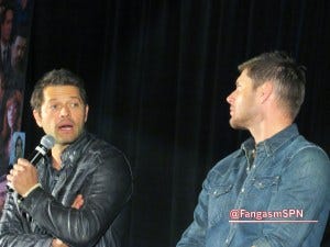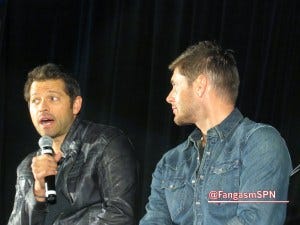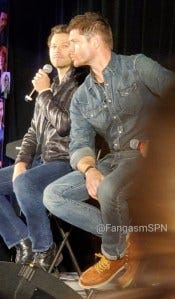What is usually the Jared and Jensen panel on Sunday was a Jensen and Misha panel instead. They started out doing a bit about refusing to speak to each other, reflecting the falling out that Dean and Castiel just had on the show. Every time one would turn toward the other, the other would turn away.