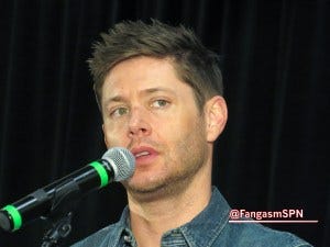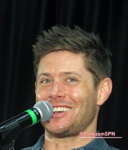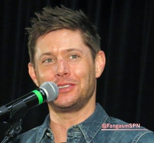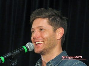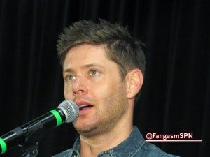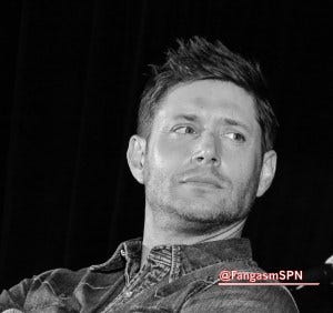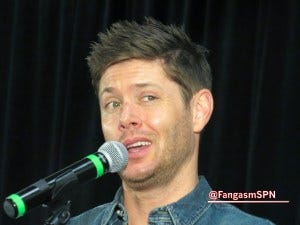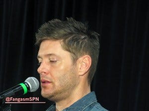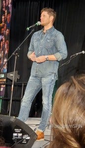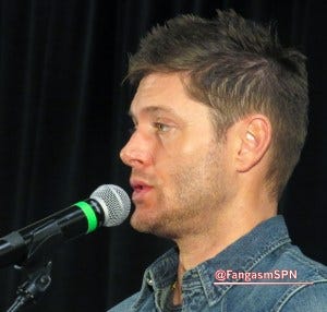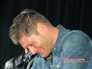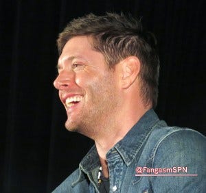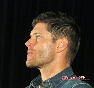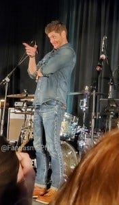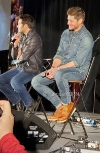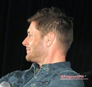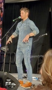 Sunday dawned too early (it’s a theme at the cons). Jensen did the gold panel alone, something that I don’t think has happened before. He wore denim on denim, which apparently is called a Canadian Tuxedo, and his hair was all floofy floof and …okay, I’ll try to concentrate.