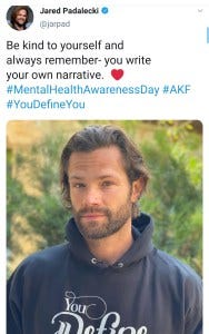Jared started a new AKF campaign with Stands that included a plaid AKF charm and a stuffed AKF moose, which is seriously adorable. He did a facebook live about the campaign, which he hasn’t done in one million years, and posted a gorgeous photo in the You Define You hoodie and with his new Walker haircut. Mmm.