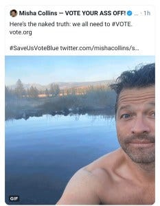 Misha went naked to get out the vote, to fandom’s sincere appreciation, used his text line to help get the vote out, and made sure water and snacks were handed out to voters in Georgia standing in insanely long lines to vote, and generally kept on working to save the world. And look adorable doing it.