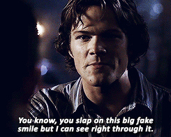 Sam: You know, you slap on this big fake smile but I can see right through it. Because I know how you feel, Dean. Dad’s dead. And he left a hole and it hurts so bad you can’t take it. But you can’t just fill that hole with whoever you want to, it’s an insult to his memory!