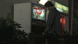 Cut to a factory, a worker anxious and hearing noises. Once again, we’re relating to the person who seems like he’s in danger, but once again that’s the vampire and Gordon the stalker.