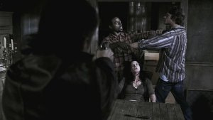 Sam frees Lenore and carries her out. Gordon moves to stop him, but Dean keeps his gun on Gordon and tells him “uh uh Gordon.” At first Gordon doesn’t believe Dean will really stop him, but Dean doesn’t lower his weapon.
