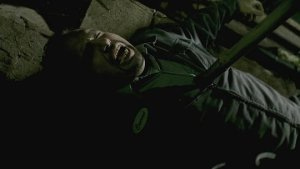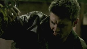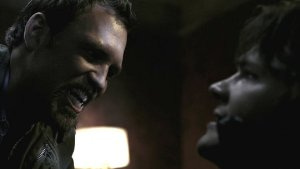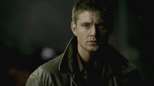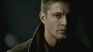 Suddenly Sam Winchester appears and saves him, while Dean spears the vampire and then uses the saw to decapitate him, blood spraying him all over. He looks like a man possessed, reveling in the violence of the kill and the blood splattering him.