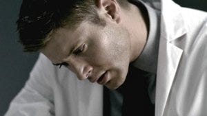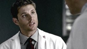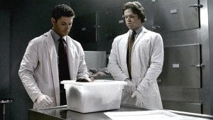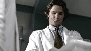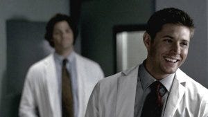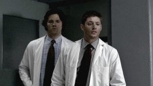 Sam and Dean go on to the hospital and to the morgue to check it out for themselves, looking dapper in their white coats as they now try to pull off being doctors. But first they have to get rid of the young intern, wearing a name tag that says “J. Manners”, a nice homage to Kim Manners, who was such a huge part of the show at this time (and forever, really, because his impact just carried on).