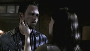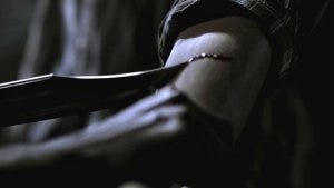 Sam realizes that Gordon knew all along that these particular vampires weren’t hurting anyone, but he was determined to kill them anyway. Gordon retorts that them being nice doesn’t change anything, and he can prove it. Before Dean can react, Gordon grabs Sam and slices across his arm, cutting him. He then holds the knife to Sam’s throat and drags him to stand over Lenore.